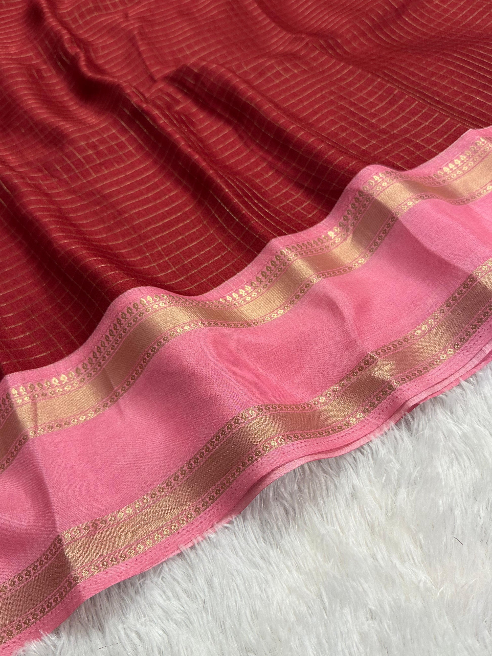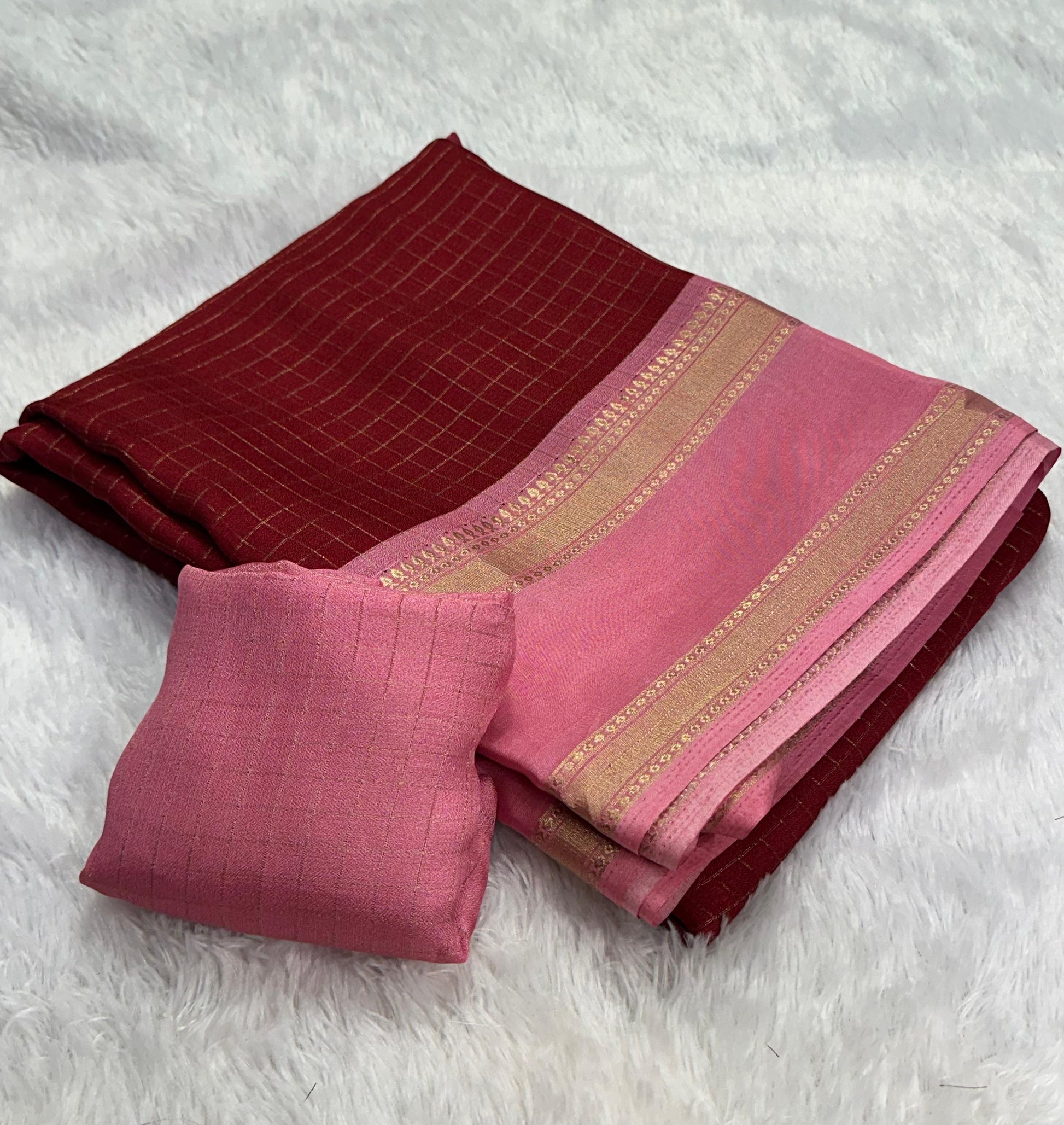 Soft mysore crepe with zari chex pattern and contrast bentex border concept with contrast crepe blouse